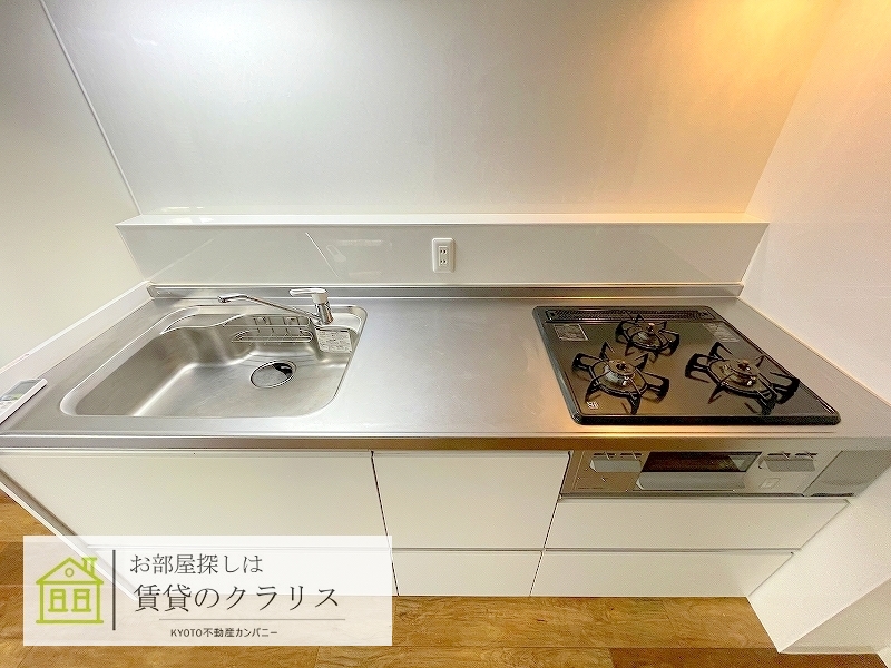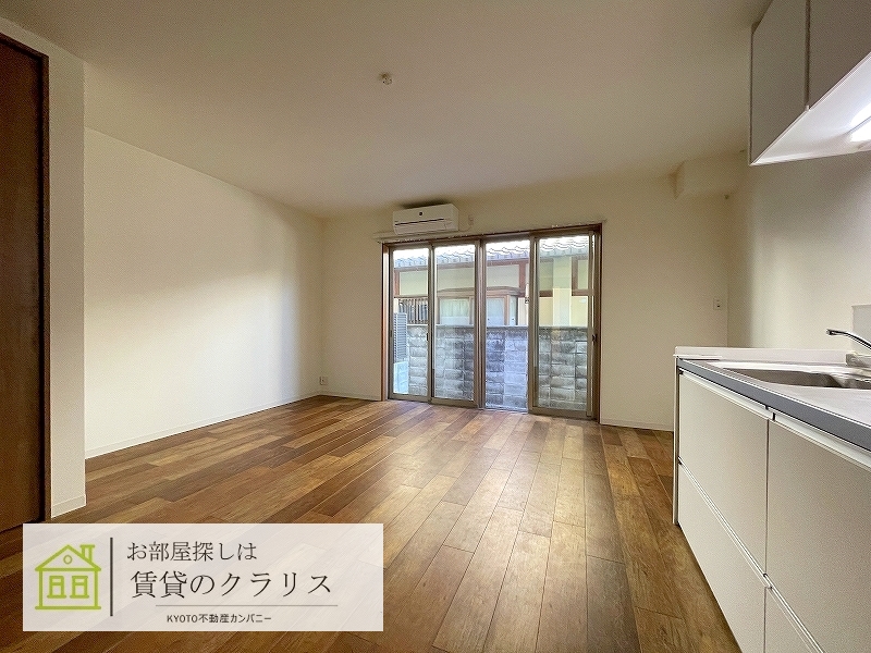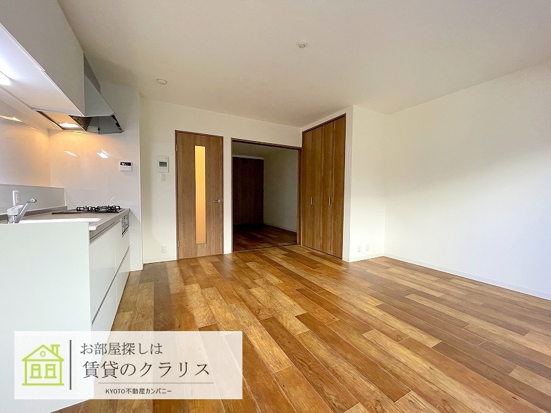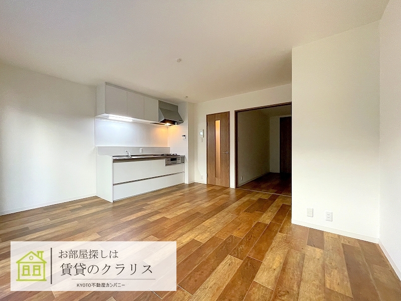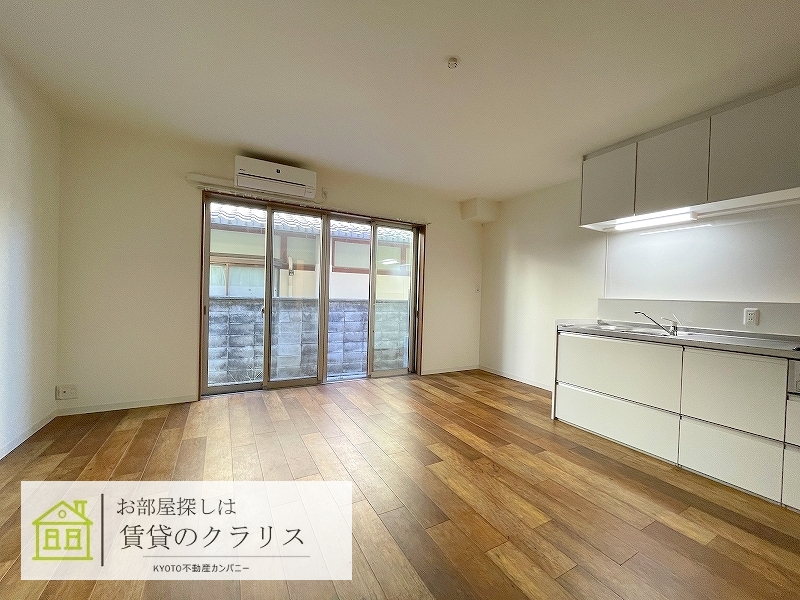 京都市西京区の賃貸!令和3年築のお洒落な「アメリカンテイスト」なフローリングの1LDK♪広めのシステムキッチンや追い焚き機能付きバス、シャンプードレッサーなど設備も充実♪「インターネットも無料」!1階ですが通り沿いではなく侵入されずらい配置のお部屋ですので安心です♪もちろん防犯カメラやオートロック等のセキュリティ面も充実しています。比較的駅も近く、コンビニやスーパーも徒歩圏内にございますので便利です♪